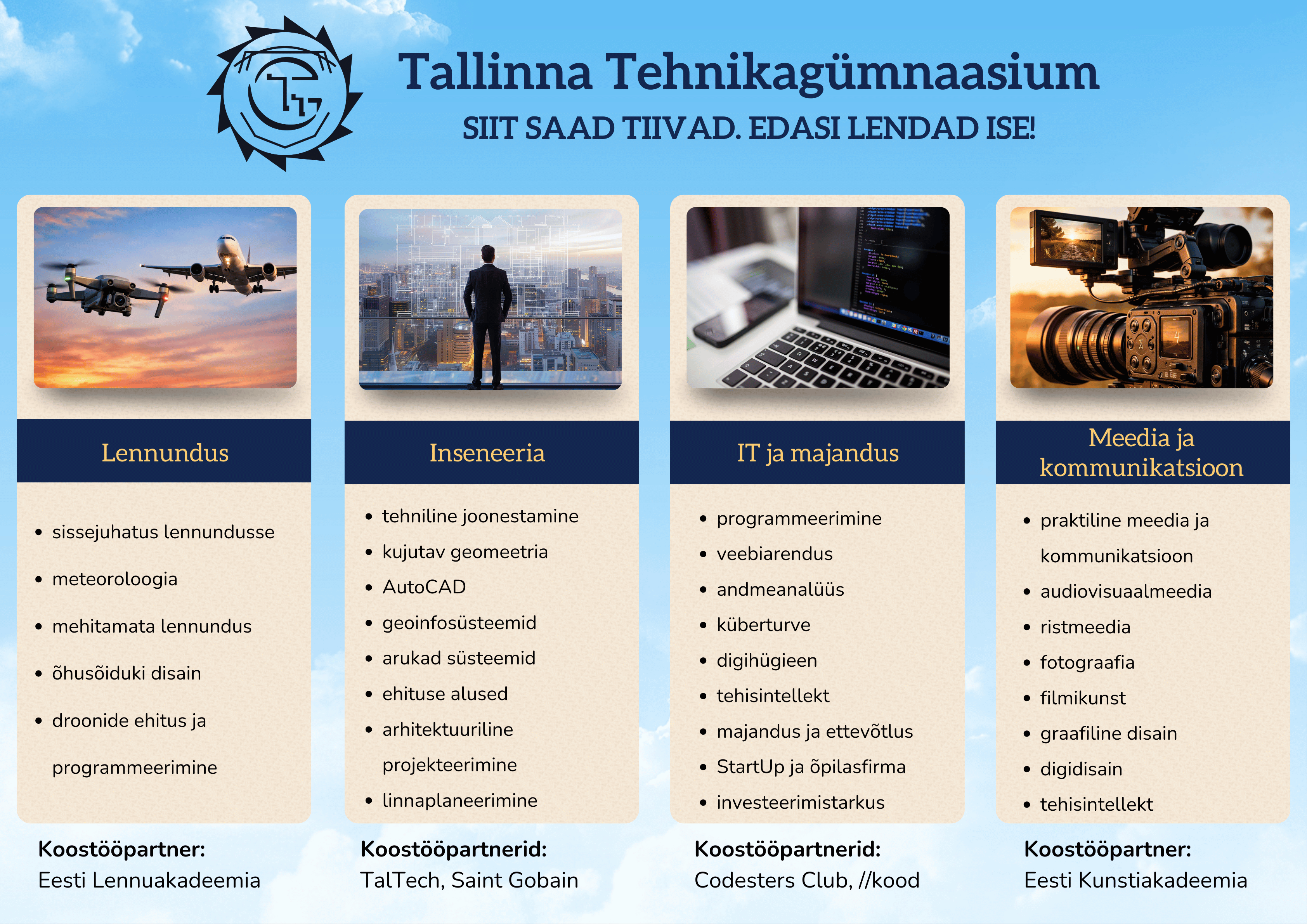 Tallinna tehnikagümnaasiumis alustab sügisest õppesuundade-põhist õpet, sisseastujad saavad valida inseneeria, IT ja majanduse, meedia ja kommunikatsiooni ning lennunduse õppesuundade vahel.