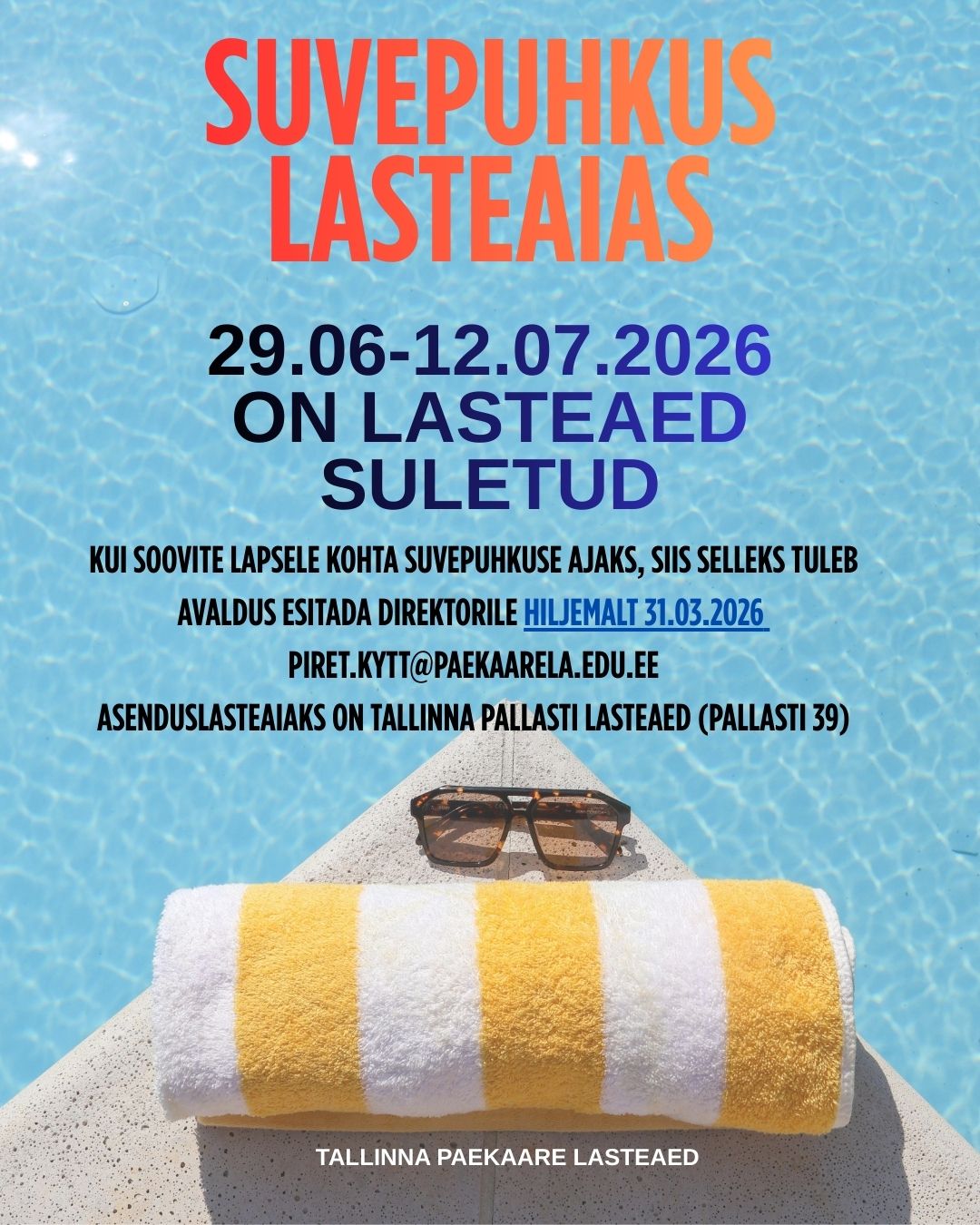 Tallinna Paekaare Lasteaed on suvepuhkuseks suletud 29.06-12.07.2026. Kui soovite selleks perioodiks lapsele kohta asenduslasteaias, siis tuleb teha...