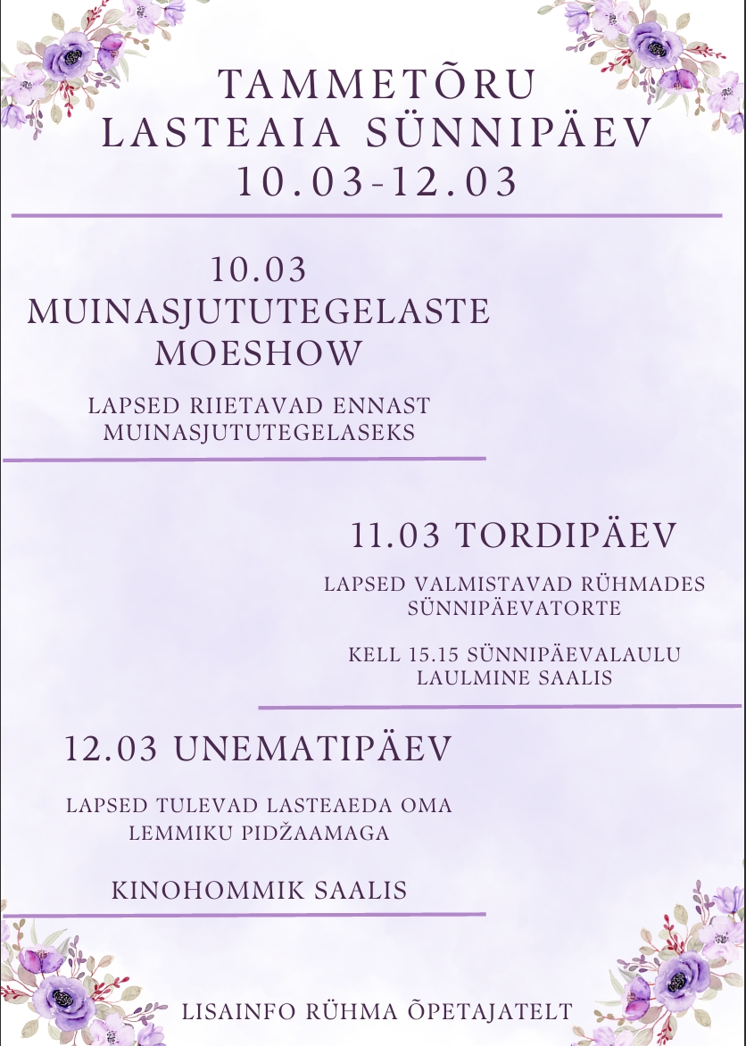 Tallinna Tammetõru Lasteaed tähistab oma sünnipäeva toredate ühisüritustega. Teisipäeval (10.03) toimub muinasjututegelaste moeshow, kus lapsed saavad...