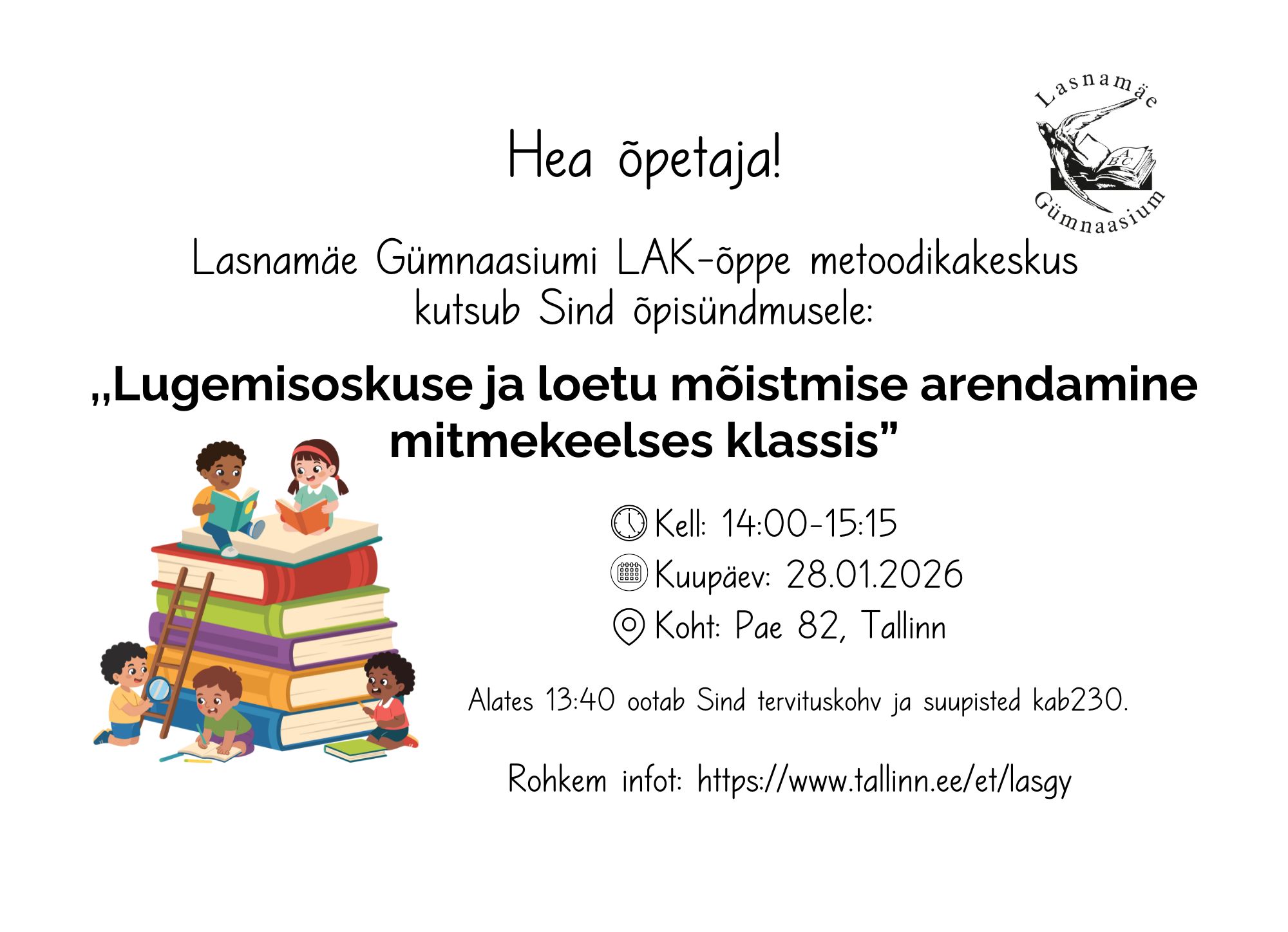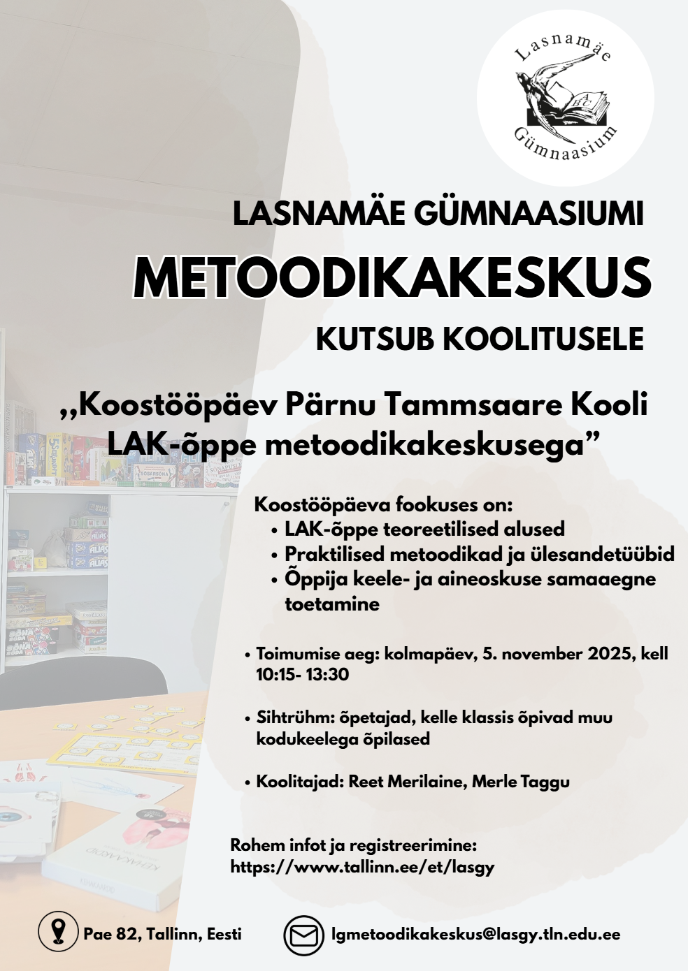 Ootame Teid Tallinna Lasnamäe Gümnaasiumi ja Pärnu Tammsaare kooli LAK-õppe metoodikakeskuste koostööpäevale „LAK-õppe põhimõtted – teooriast praktikasse“.