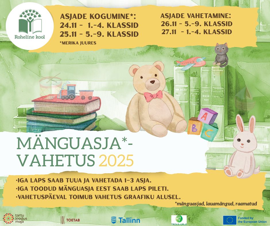 Rohelise kooli programm koos Tallinna linnaga kutsub üles lasteaedu ja koole üle Eesti osalema 24.-28. nov 2025 toimuvas mänguasjavahetuskampaanias: “Anna oma mänguasjale uus elu!”